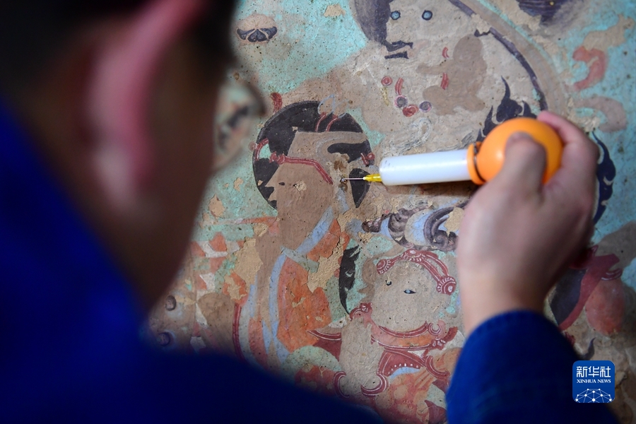 4月19日,在莫高窟第231窟,楊金禮在修復(fù)出現(xiàn)病害的壁畫。新華社記者 杜哲宇 攝