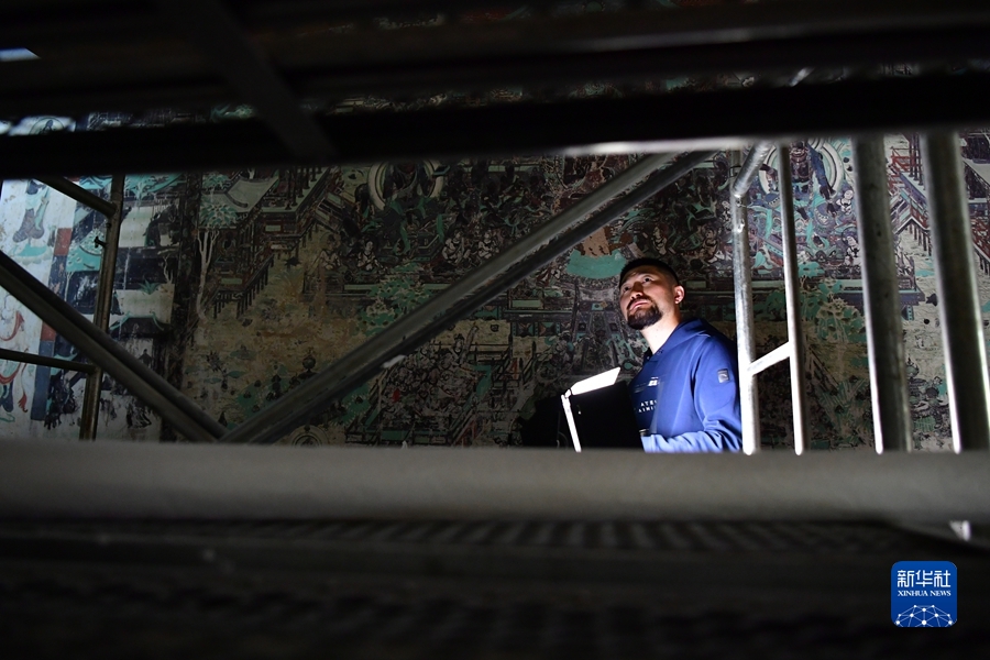 楊金禮今年35歲,他2006年就來到莫高窟,從學(xué)徒做起,逐漸成長為敦煌研究院文物保護(hù)技術(shù)服務(wù)中心的一名壁畫修復(fù)工作者。楊金禮每天都會(huì)和同事來到洞窟內(nèi)“面壁修復(fù)”,通過專業(yè)技術(shù)手段解決壁畫產(chǎn)生的起甲、空鼓、酥堿等病害,幫助壁畫對抗時(shí)間的流逝。