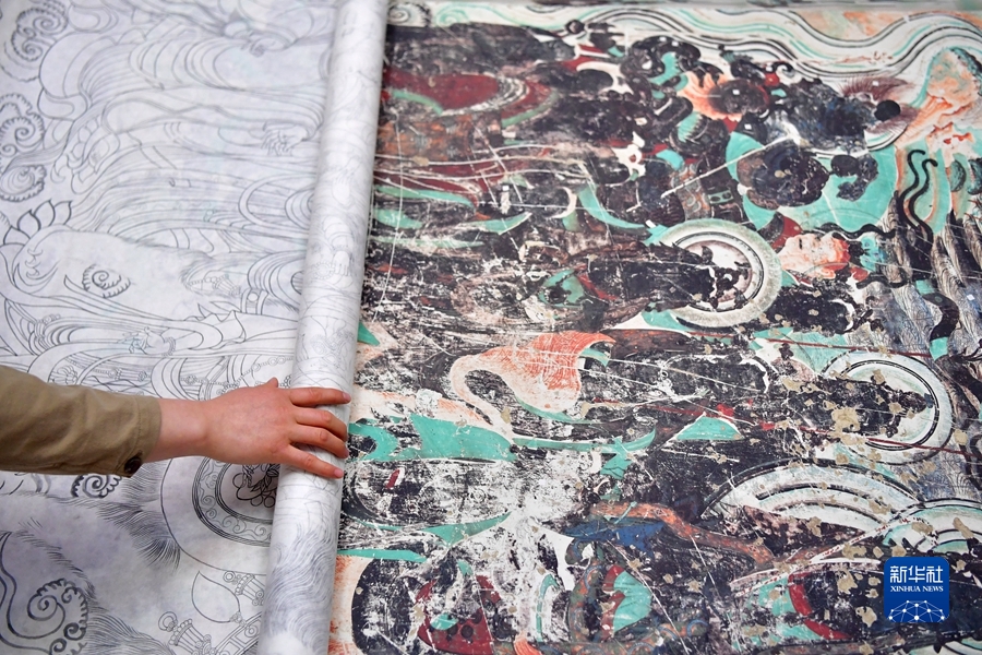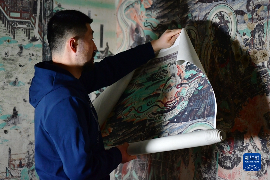 4月19日,在莫高窟第172窟,劉小同在對比臨摹壁畫的細(xì)節(jié)。新華社記者 杜哲宇 攝