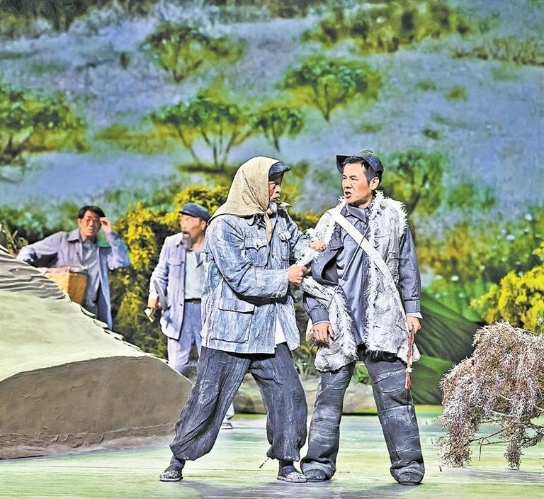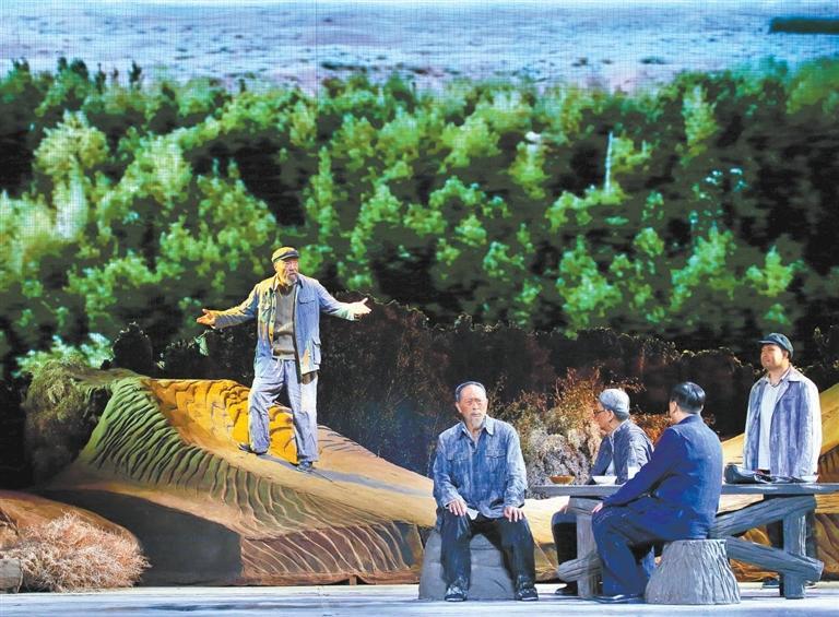 現(xiàn)實題材是話劇藝術(shù)的寵兒,在話劇進(jìn)入中國一百多年的時光中,現(xiàn)實題材創(chuàng)作占據(jù)相當(dāng)大的比例。在近當(dāng)代中國歷史的進(jìn)程中,話劇始終起著敢為天下先、針砭時弊的作用,但話劇又有其極其特殊的藝術(shù)框范。人們在觀看話劇時,仿佛就是在觀看自己的人生,觀看自己和身邊最熟悉的人們,這是話劇藝術(shù)獨具的極高的審美要求。尤其是現(xiàn)代題材的創(chuàng)作,稍有不慎便會陷入同質(zhì)化的僵硬模式,使舞臺藝術(shù)失去應(yīng)有的美感。話劇《八步沙》讓6個老漢成為舞臺聚光燈下的主角,體現(xiàn)了創(chuàng)作者們呼應(yīng)時代之需,為最普通的農(nóng)民寫生立傳的拳拳之心。6個老農(nóng)民談不上人們通常意識中的“美”,“治沙”這樣的故事也相對比較單調(diào),不大容易出彩,而創(chuàng)作者們以八步沙這個真實的地名作為劇名,以“六老漢”治沙這個真實的事件作為全劇的敘述內(nèi)容,卻能宕開一筆把特定的外部環(huán)境與人物的內(nèi)心世界巧妙地融為一體,為全劇注入了濃郁飽滿的戲劇情境和情感,使這部話劇有了獨屬于自己的一份力度、一份無法替代的光彩。全劇的情節(jié)一曲三折,以小見大,當(dāng)黑壓壓的沙塵暴鋪天而來的時候,當(dāng)六老漢在嚴(yán)酷的環(huán)境中吃盡苦頭,摸索出“一棵樹,一把草,壓住沙子防風(fēng)掏”的寶貴經(jīng)驗,使漫無邊際的沙漠終于出現(xiàn)一抹綠色,繼而眼看著一棵又一棵綠樹成活成林,終于成為一片綠洲的時候,我相信觀眾的心也被藝術(shù)琴弦撥動,始終被劇情牽著走,為劇中人物的命運擔(dān)心、懸心、痛心、開心,從中深深地感受到劇中所蘊(yùn)藏的豐富內(nèi)涵和它所傳達(dá)出的真切意趣。