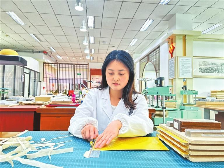 從事這項工作快滿3年了,從最開始的“坐不住”到現(xiàn)在的“沉得下”,羅雪瑞的修復技藝在不斷進步。“我一直就比較喜歡做手工,古籍修復不僅讓我感到充實,也讓我非常有成就感。”羅雪瑞說,每次來到自己的工作臺前,心緒就能很快靜下來,沉浸在古籍的世界里,感覺特別踏實。