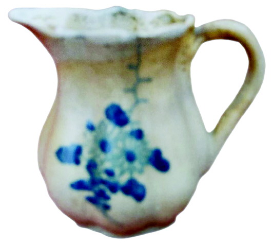 該口杯高10cm,上口手捏黏泥接連,珍珠釉澆注粘連處留有數(shù)滴珍珠釉淚珠??谘厍皟A,連口粘痕明顯裸露。通體呈吊南瓜分棱,八道指泥壕顯八股棱條。造型珍瓏靈秀,珍貴之處在于上施淺瑪瑙釉,體面使用藍寶石礦料畫一束盛開的菊花。畫筆嫻熟簡練,富有立體感,且活靈活現(xiàn)。在背面腰中部,用淡青花題“□□”二字,字雖模糊不清,但胎土細膩,瓷壁輕薄又堅硬如骨,胎底色黃中泛紅,瓷體表面青釉中又泛小針褐色點。把手處,窯變?yōu)轵球咀吣嗉y。這種泥紋,沉重古樸,明亮而深沉,是釉層在干燥或燒成時發(fā)生干裂,后在高溫階段又有釉流入填補而形成的。在民國以前,蚯蚓紋曾被作為判斷鈞釉的唯一標準。