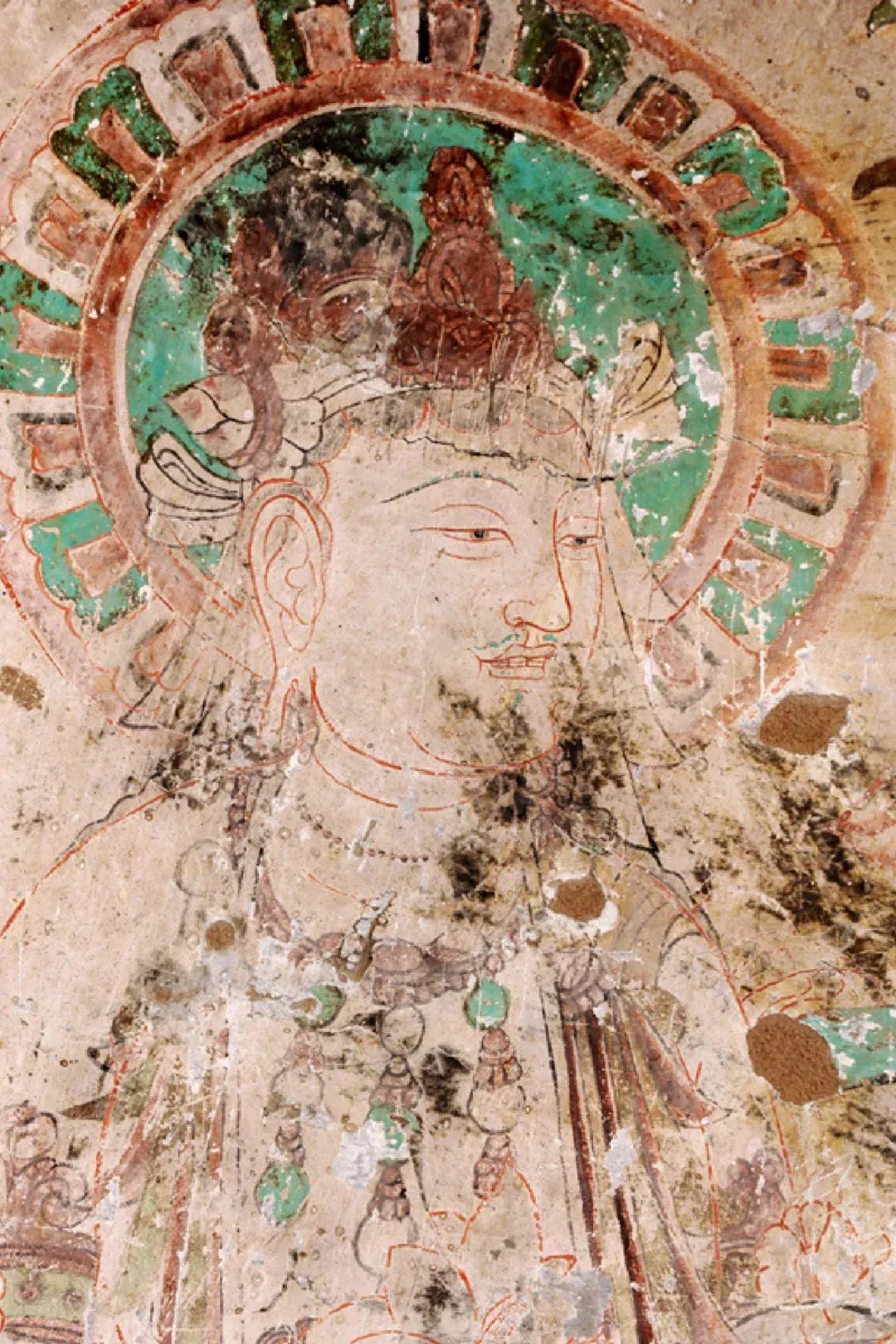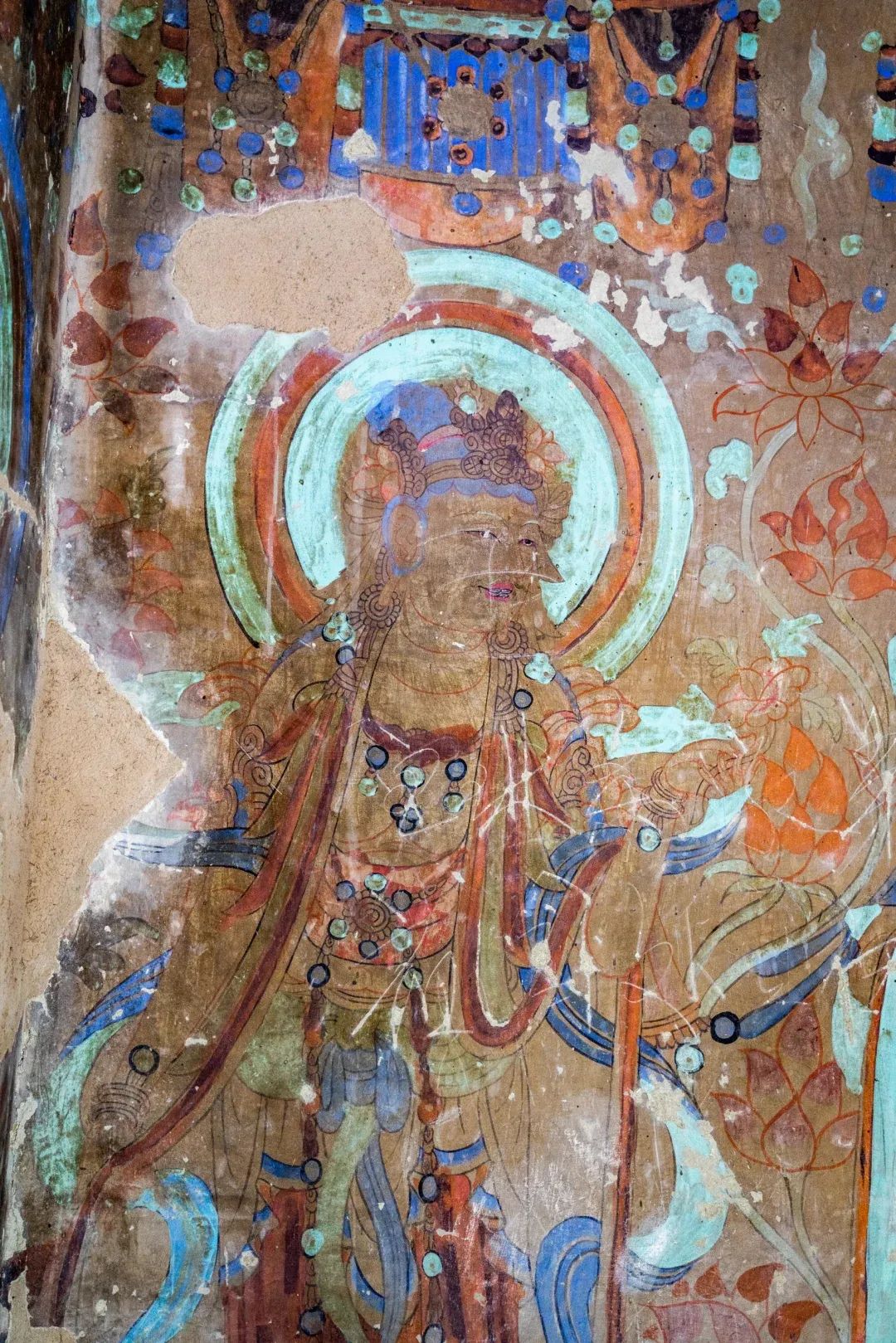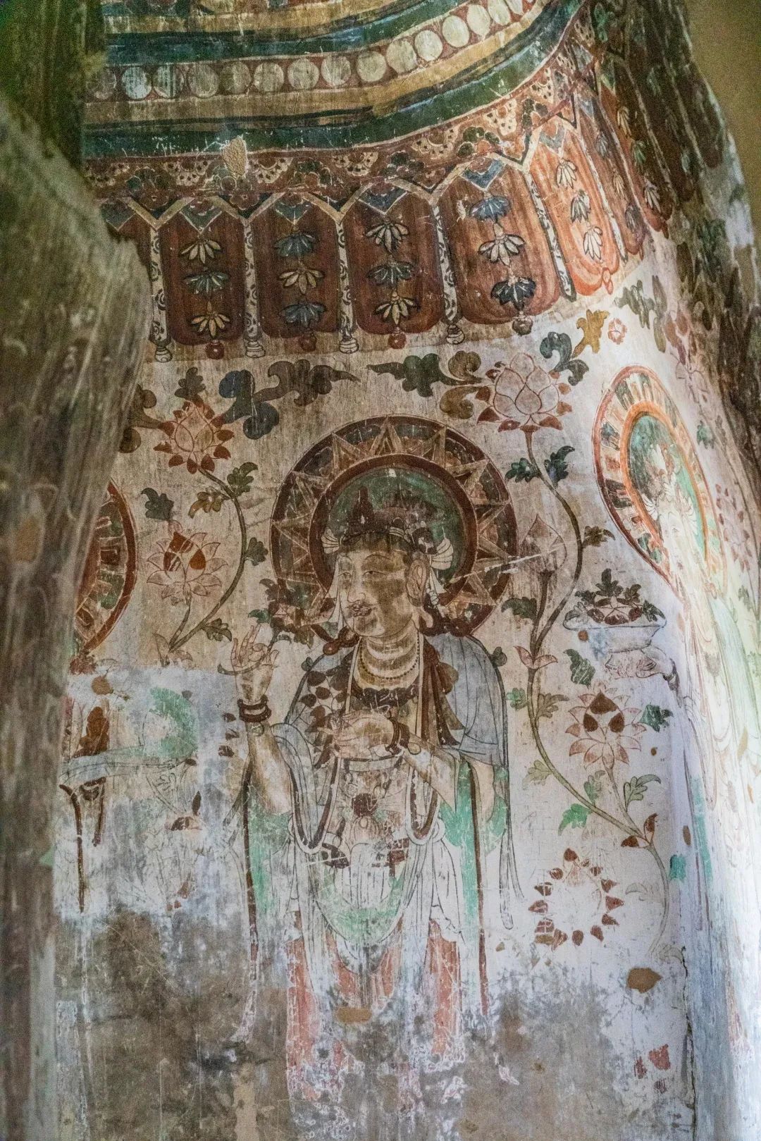現(xiàn)在第4窟中早期塑像多數(shù)已毀,但仍殘存少數(shù)幾身,十分珍貴;各側(cè)面表層為西夏重修時繪制的壁畫;柱座與柱身的兩層自下而上逐層縮?。恢行闹嬖谖飨臅r改造成一橢圓形的大背屏,背屏正面表層為清代重繪的壁畫;四壁及頂上壁畫也多為西夏時期。