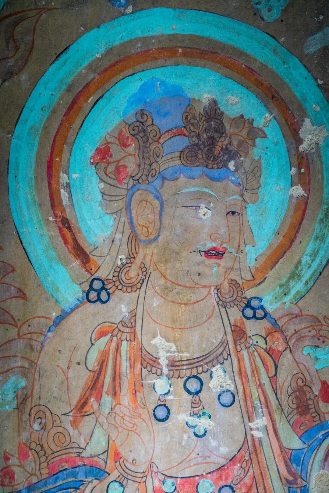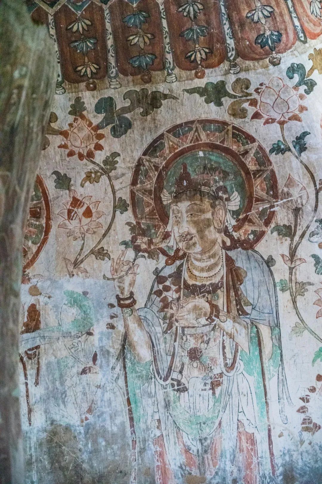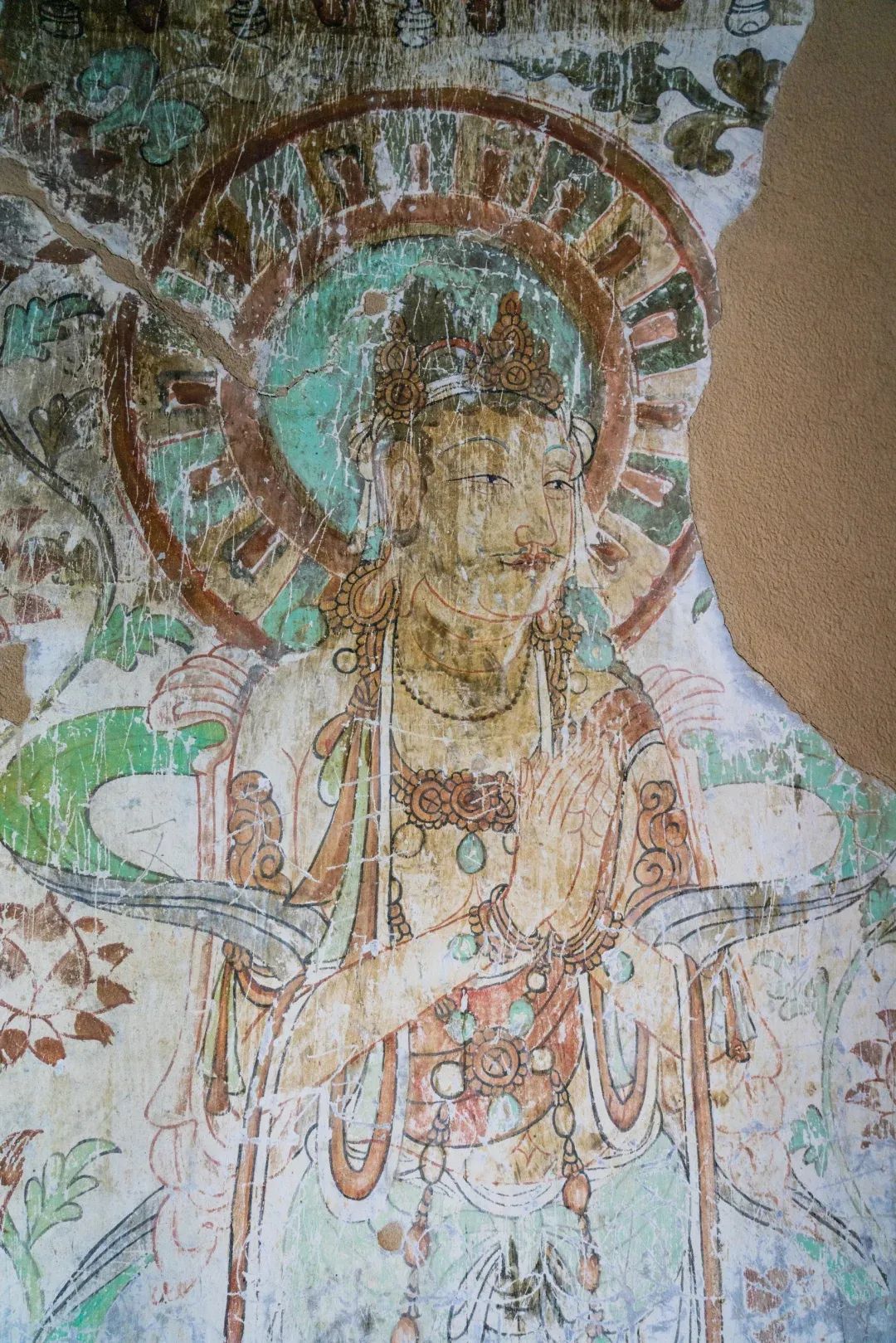 現(xiàn)在第4窟中早期塑像多數(shù)已毀,但仍殘存少數(shù)幾身,十分珍貴;各側(cè)面表層為西夏重修時繪制的壁畫;柱座與柱身的兩層自下而上逐層縮?。恢行闹嬖谖飨臅r改造成一橢圓形的大背屏,背屏正面表層為清代重繪的壁畫;四壁及頂上壁畫也多為西夏時期。