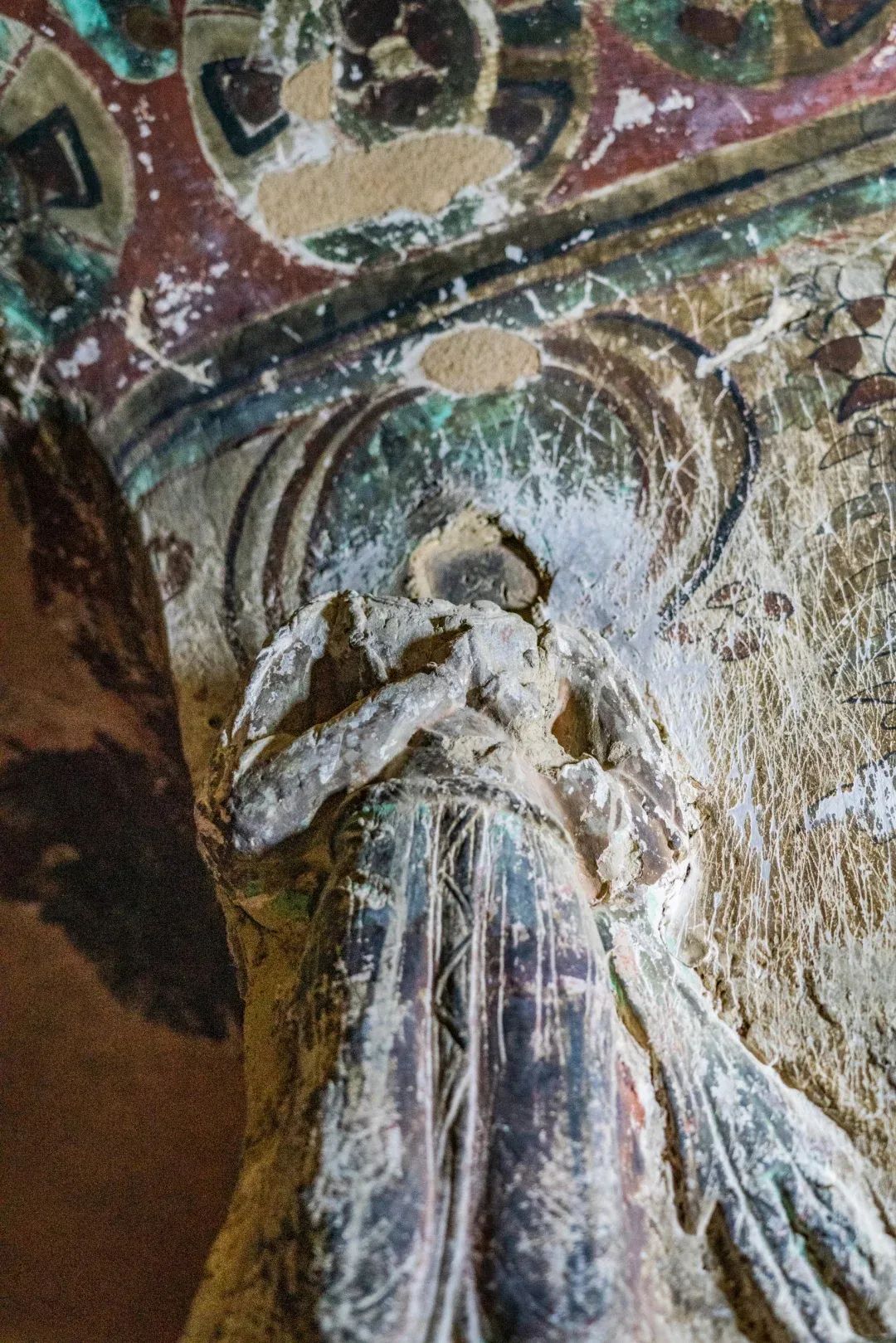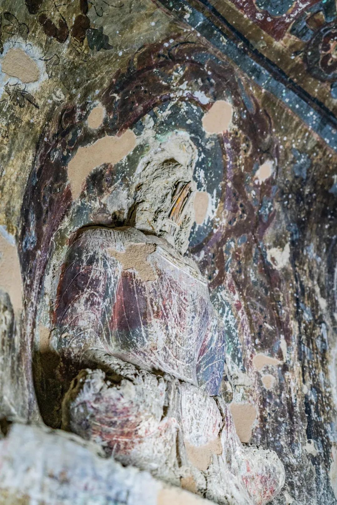 塑像題材為簡單的一佛二菩薩。內(nèi)塑一坐佛像,龕外兩側(cè)各塑一脅侍菩薩像,上層開—淺龕,中間塑一結(jié)跏趺坐佛像,面相渾圓,雙手?jǐn)n于袈裟內(nèi),衣角垂于腹前,陰線刻衣紋。頭部均毀,露出麥草扎成的骨干。龕外兩側(cè)各塑一脅侍菩薩像,雙手合十,佩項圈、瓔珞,披帛搭于肩上,帛帶下垂外張。佛與菩薩,作風(fēng)古樸,技法概括而又簡練,很接近敦煌莫高窟259窟,其時代可能為北涼時期。