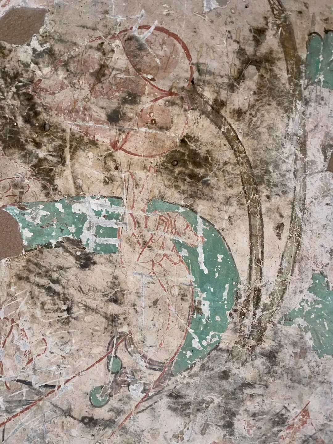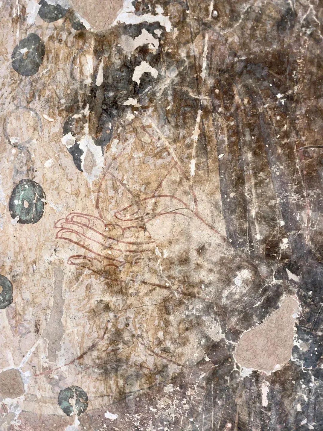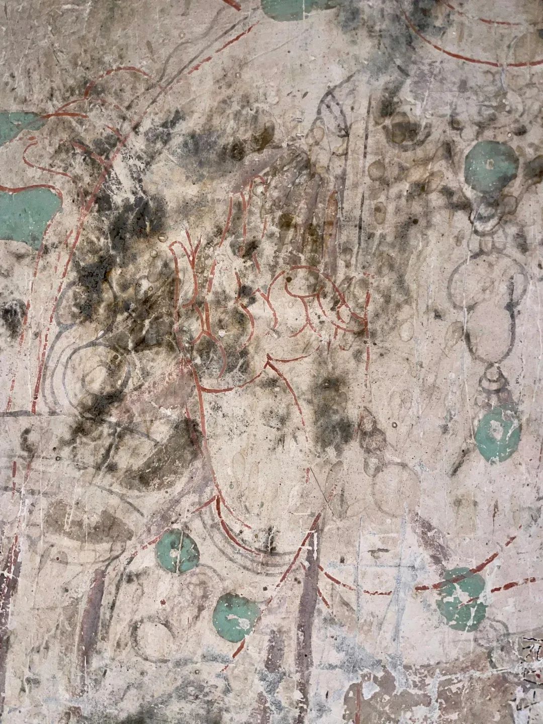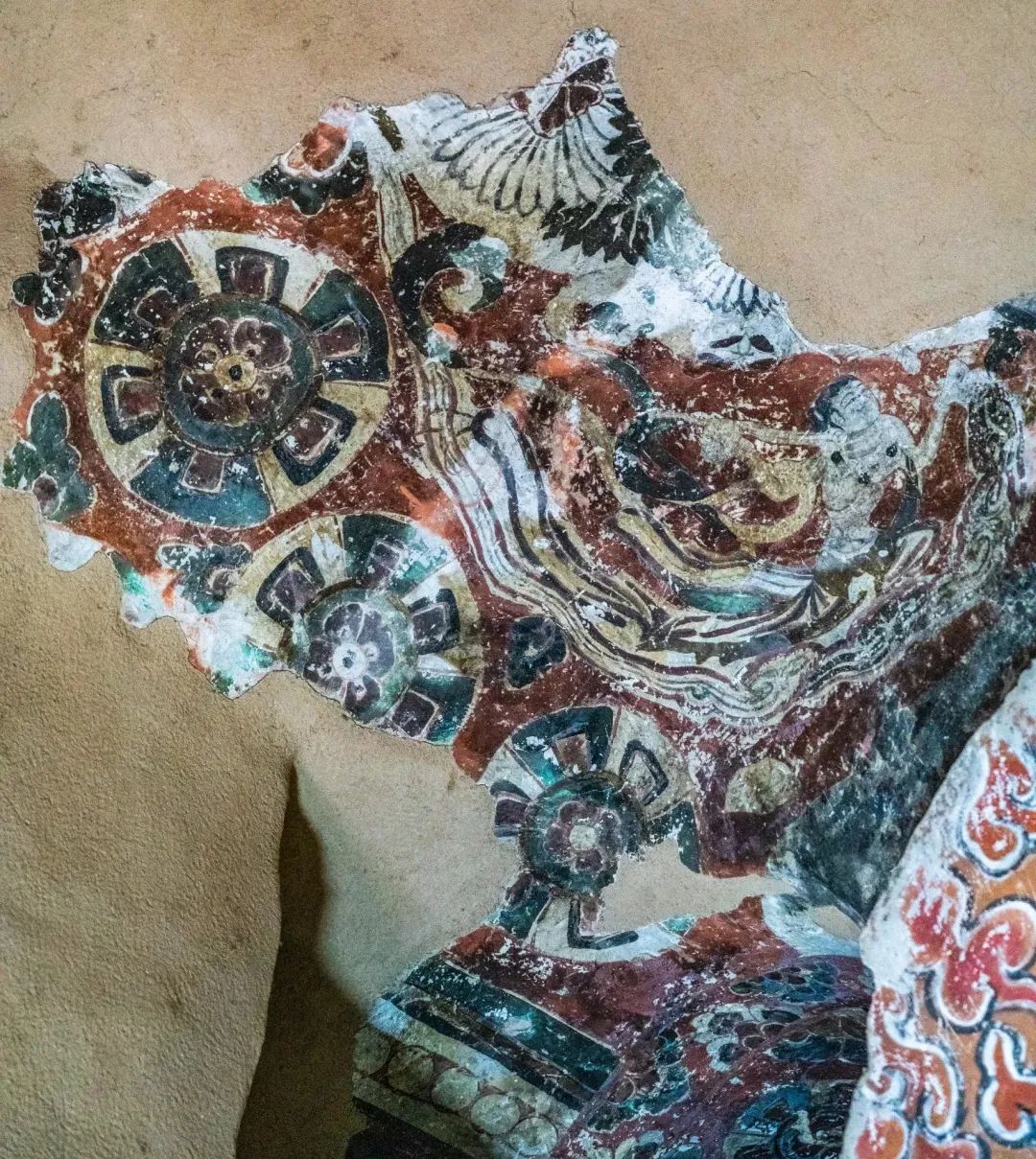 昌馬石窟第4窟洞窟形制及其殘存的塑像對于研究中國早期石窟藝術(shù)與佛教造像藝術(shù)極其重要。窟內(nèi)壁畫內(nèi)容是四壁上方畫條式旌幡,下畫供養(yǎng)菩薩,身高近2米,今殘存20身,菩薩周圍畫纏枝蓮,與第二窟基本相同??唔斍鞍氩康卣檀蟛糠置撀?,靠近中心柱正面上部右側(cè)的部位殘存龜形六瓣團(tuán)花圖案與一身飛天及菊花紋圖案。后部中心柱頂部周圍窟頂表面繪龜形六瓣團(tuán)花、連珠紋等圖案。