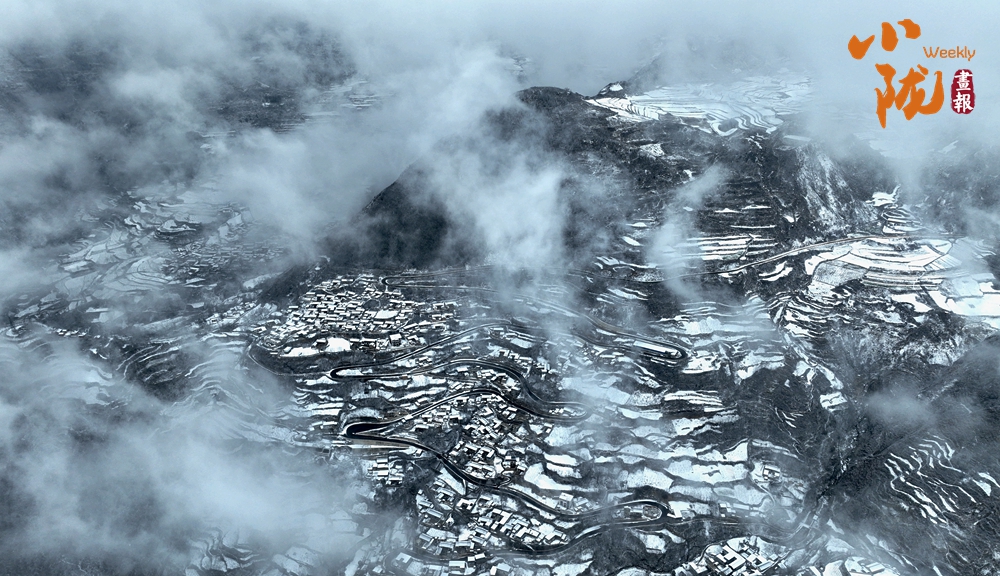 雪后梯田云遮霧蓋,黑白分明的線條優(yōu)雅而生動,展現(xiàn)出別樣的韻味。