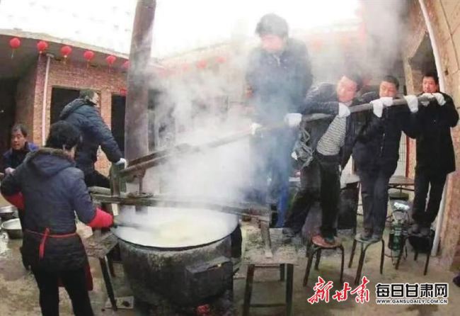 在慶陽鄉(xiāng)村,一場(chǎng)紅白喜事的饸饹流水席往往能持續(xù)好幾天,數(shù)十張方桌一字?jǐn)[開,掌勺的主廚指揮著幫廚,以每分鐘出湯十幾碗的效率,完成著這場(chǎng)飲食行為藝術(shù)。