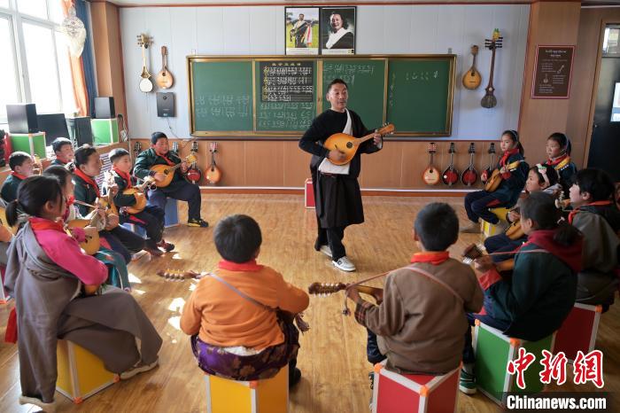 2月26日,甘肅省甘南藏族自治州瑪曲縣寄宿制藏族小學(xué)龍頭琴彈唱社團活動,加措正在教孩子們彈唱。九美旦增 攝