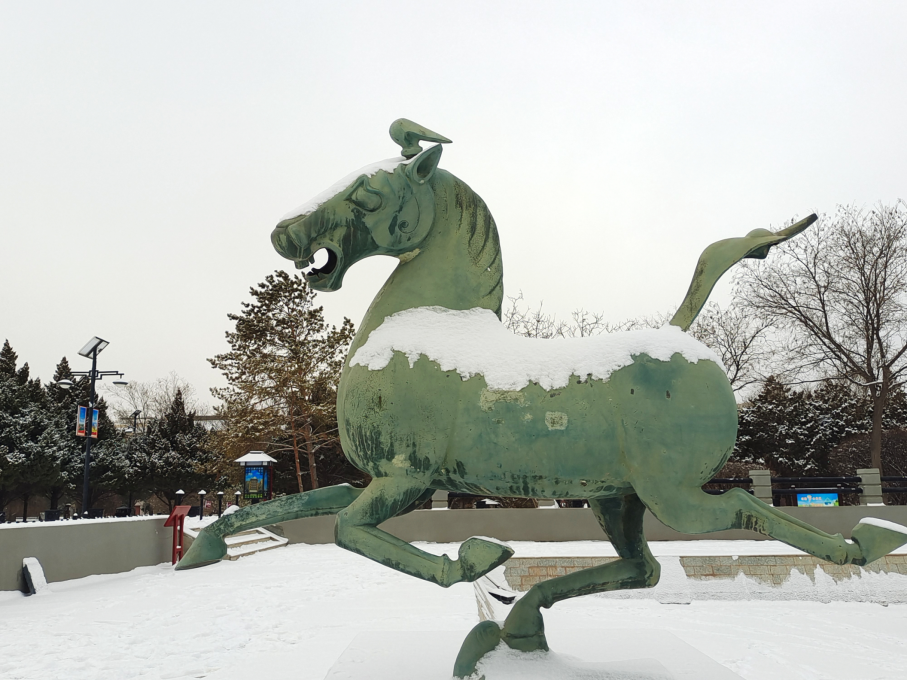 厚德載物的包容精神。特殊的地理環(huán)境,造就了涼州馬文化兼容并蓄、厚德載物的精神特質(zhì)。涼州大馬是中原馬、西域馬與蒙古馬雜交改良的產(chǎn)物,既保留了蒙古馬的耐力,又兼具西域馬的速度,這種“取長補(bǔ)短”的改良過程,本身就是包容精神的具體體現(xiàn)。“馬踏飛燕”作為東西方文化融合的藝術(shù)結(jié)晶,其形象既源于中原的“龍馬精神”,又吸納了西域“翼馬”的神話元素,成為兼容并蓄精神的具象化表達(dá)。它的鑄造工藝同樣展現(xiàn)出包容的特質(zhì),既采用了中原傳統(tǒng)的陶范鑄接法,又融入了西域藝術(shù)的浪漫主義風(fēng)格,寫實(shí)與想象完美結(jié)合,形成了形神兼?zhèn)?、氣韻生?dòng)的藝術(shù)效果。