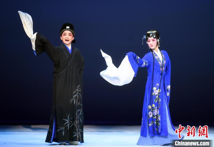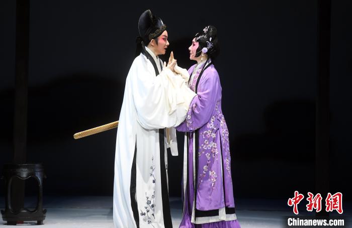 在劇中,唐琬由國家一級演員鄭全(右)飾演,陸游則由中國戲劇梅花獎(jiǎng)得主陳麗宇(左)飾演。 記者劉可耕 攝