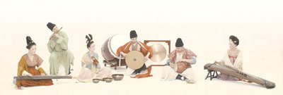 淡黃色的背景如宣紙鋪陳,樂師們身著朱紅圓領(lǐng)袍、艾綠上衣、藕色絹衫等,或撫古琴,或吹笛簫,或擊大鼓……演奏的是中國傳統(tǒng)樂器,流淌的樂音卻是電影《哈利·波特》主題曲、巴赫《G弦上的詠嘆調(diào)》……