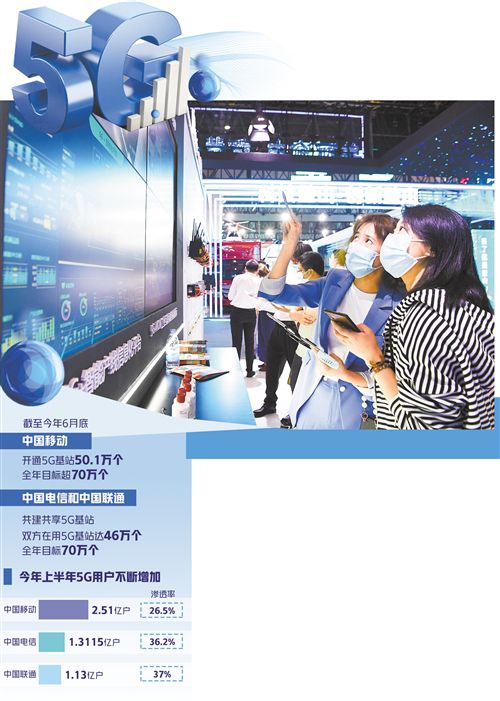 從5G基站看,截至今年6月底,中國(guó)移動(dòng)已開通5G基站50.1萬(wàn)個(gè),全年目標(biāo)超過(guò)70萬(wàn)個(gè);中國(guó)電信和中國(guó)聯(lián)通共建共享5G基站,目前雙方在用5G基站達(dá)46萬(wàn)個(gè),全年目標(biāo)也是70萬(wàn)個(gè)。工信部數(shù)據(jù)顯示,截至今年6月底,我國(guó)累計(jì)建設(shè)5G基站96.1萬(wàn)個(gè),覆蓋全國(guó)所有地級(jí)以上城市,5G手機(jī)終端連接數(shù)達(dá)3.65億戶,占全球80%以上。