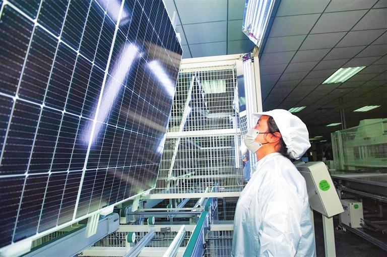 酒泉正泰新能源科技有限公司職工正在車間內(nèi)檢查組裝好的光伏發(fā)電板。