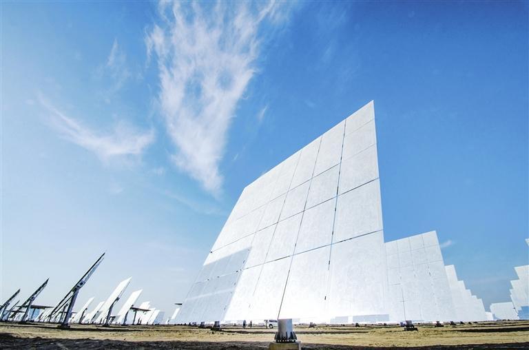 一排排風(fēng)電機(jī)組整齊列陣迎風(fēng)旋轉(zhuǎn),蔚然壯觀;成片的光伏板將茫茫戈壁裝點成浩瀚的藍(lán)色海洋,熠熠生輝;上萬塊定日鏡和吸熱塔構(gòu)成超級鏡子發(fā)電站,耀眼且震撼。