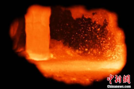 金川集團鎳冶煉廠閃速爐車間主廠房內(nèi),工作人員在閃速爐爐前燒口進行低鎳锍排放作業(yè)。