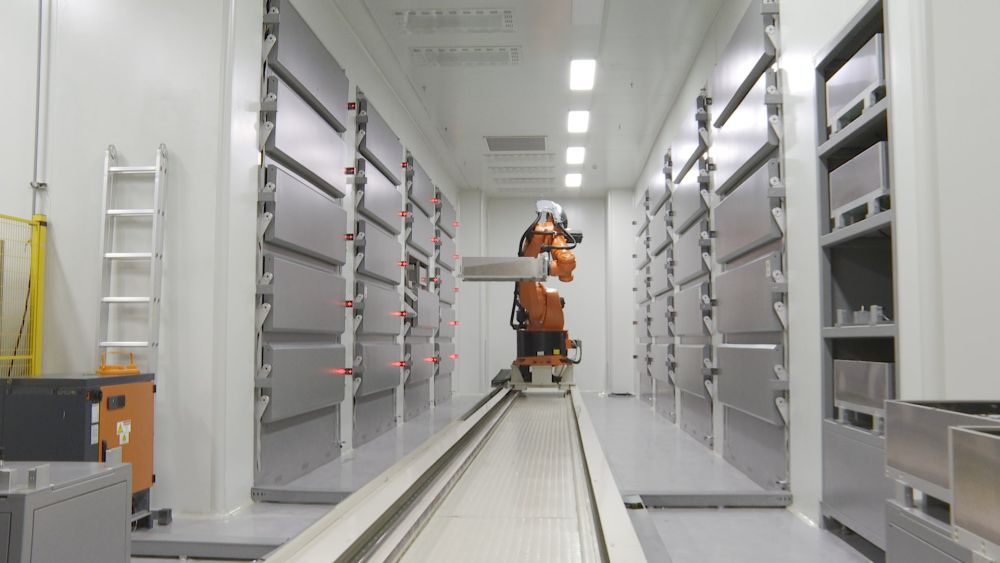 在一家企業(yè)的干燥車間內,六軸機器人正在搬運成品電池。(受訪單位供圖)