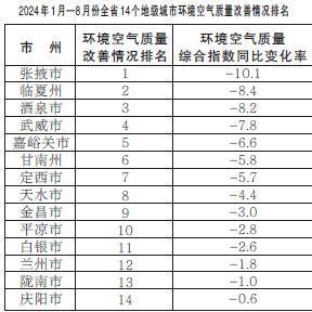 2024年1月—8月份,全省14個(gè)地級(jí)城市環(huán)境空氣質(zhì)量改善情況排名由好到差分別為:張掖市、臨夏州、酒泉市、武威市、嘉峪關(guān)市、甘南州、定西市、天水市、金昌市、平?jīng)鍪?、白銀市、蘭州市、隴南市、慶陽(yáng)市。