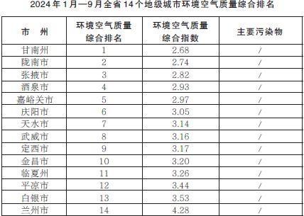 2024年1月—9月,全省14個地級城市環(huán)境空氣質量綜合排名由高到低分別為:甘南州、隴南市、張掖市、酒泉市、嘉峪關市、慶陽市、天水市、武威市、定西市、金昌市、臨夏州、平涼市、白銀市、蘭州市。