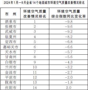 2024年1月—9月,全省14個地級城市環(huán)境空氣質量改善情況排名由好到差分別為:酒泉市、張掖市、武威市、臨夏州、定西市、嘉峪關市、天水市、甘南州、白銀市、蘭州市、金昌市、平涼市、隴南市、慶陽市。