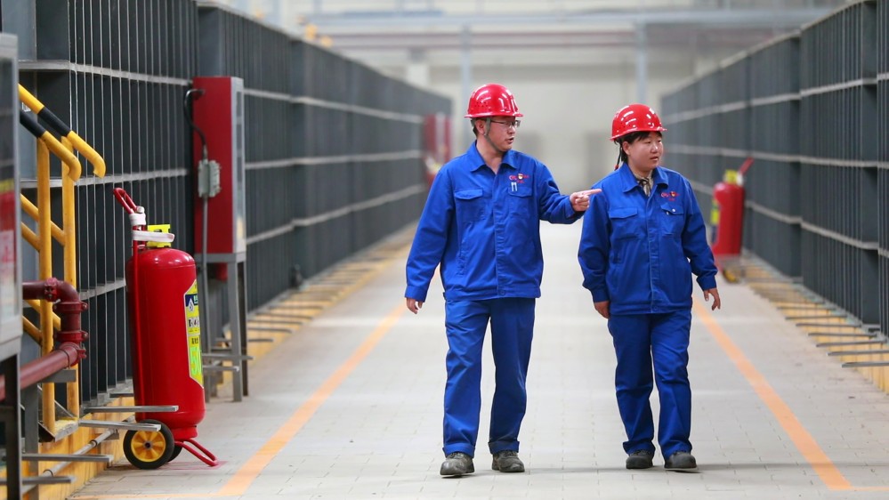 在甘肅稀土公司11000噸萃取生產(chǎn)線,兩名工作人員在巡查這套集數(shù)字化、智能化和綠色化為一體的自動(dòng)化生產(chǎn)線。(本報(bào)記者郭剛 攝)