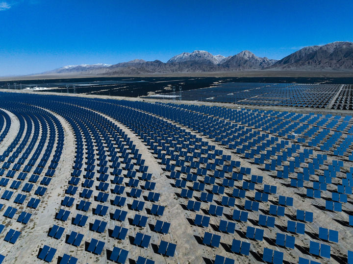 青海省海西蒙古族藏族自治州德令哈市光伏(光熱)產(chǎn)業(yè)園的光熱電站(2024年4月23日攝,無(wú)人機(jī)照片)。新華社記者 張龍 攝