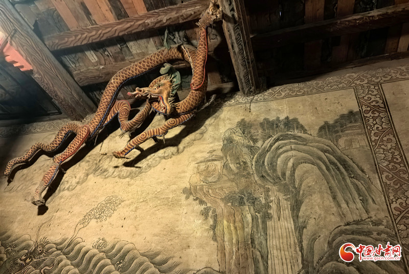 順著羅漢目視的方向望去,龍盤踞于房梁之上,若參照龍背后的壁畫,又仿佛這條龍正翱翔于天空之上。這一獨特設(shè)計,源于張掖大佛寺深厚的歷史背景。