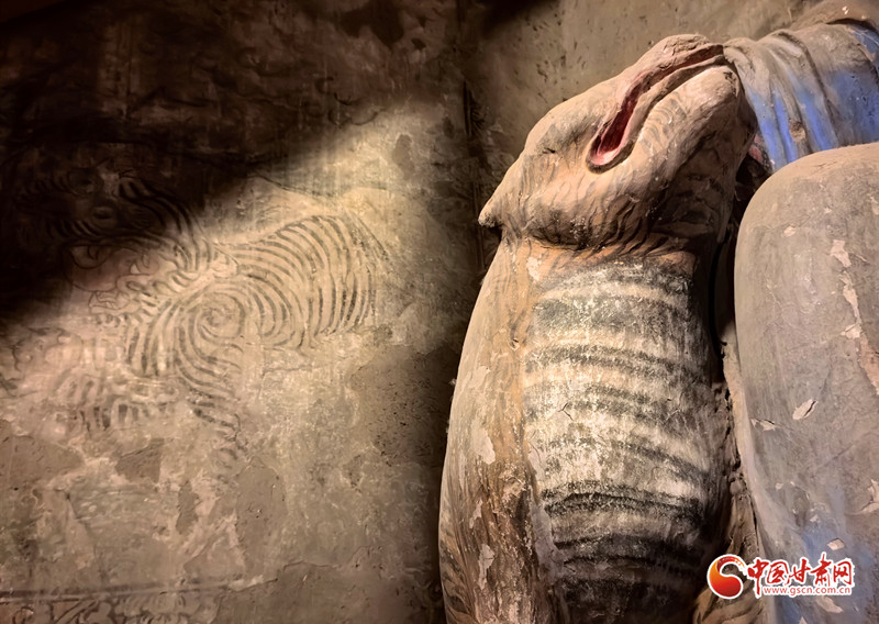 為何要將老虎塑造得如此乖巧?答案就在老虎旁邊的壁畫中。壁畫里的老虎張牙舞爪、張著大嘴,盡顯兇猛之態(tài)。而羅漢手中的老虎卻溫順如貓,這一鮮明對比,恰恰生動地說明了羅漢已將老虎降服。