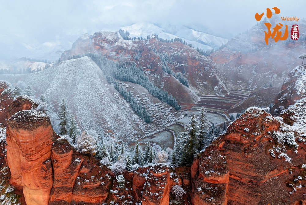 如斧劈刀削的赤壁,被冬雪溫柔地描摹,無(wú)垠的丹霞赤紅與素潔的白雪同框,赭紅似血、潔白如絮,在大地上展開(kāi)一幅對(duì)比強(qiáng)烈又和諧共存的絢麗畫卷。