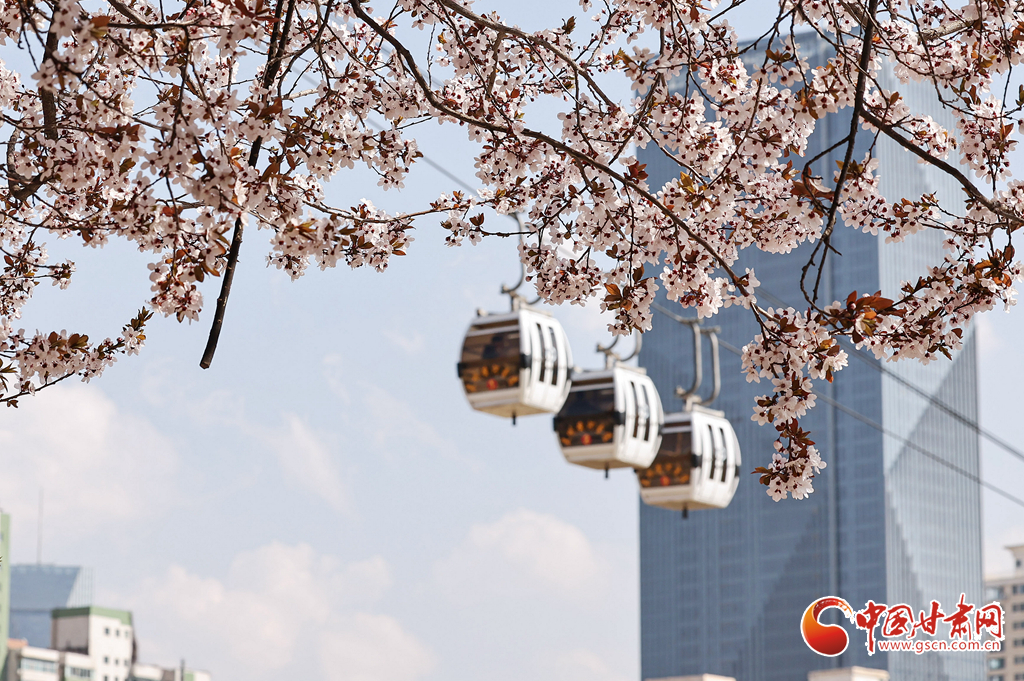 3月31日,在蘭州市城關(guān)區(qū)黃河風(fēng)情線,市民、游客乘坐纜車賞花游覽。