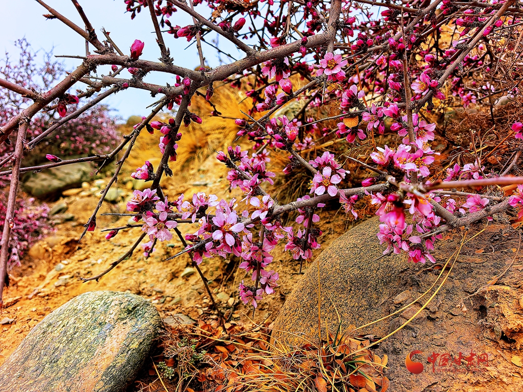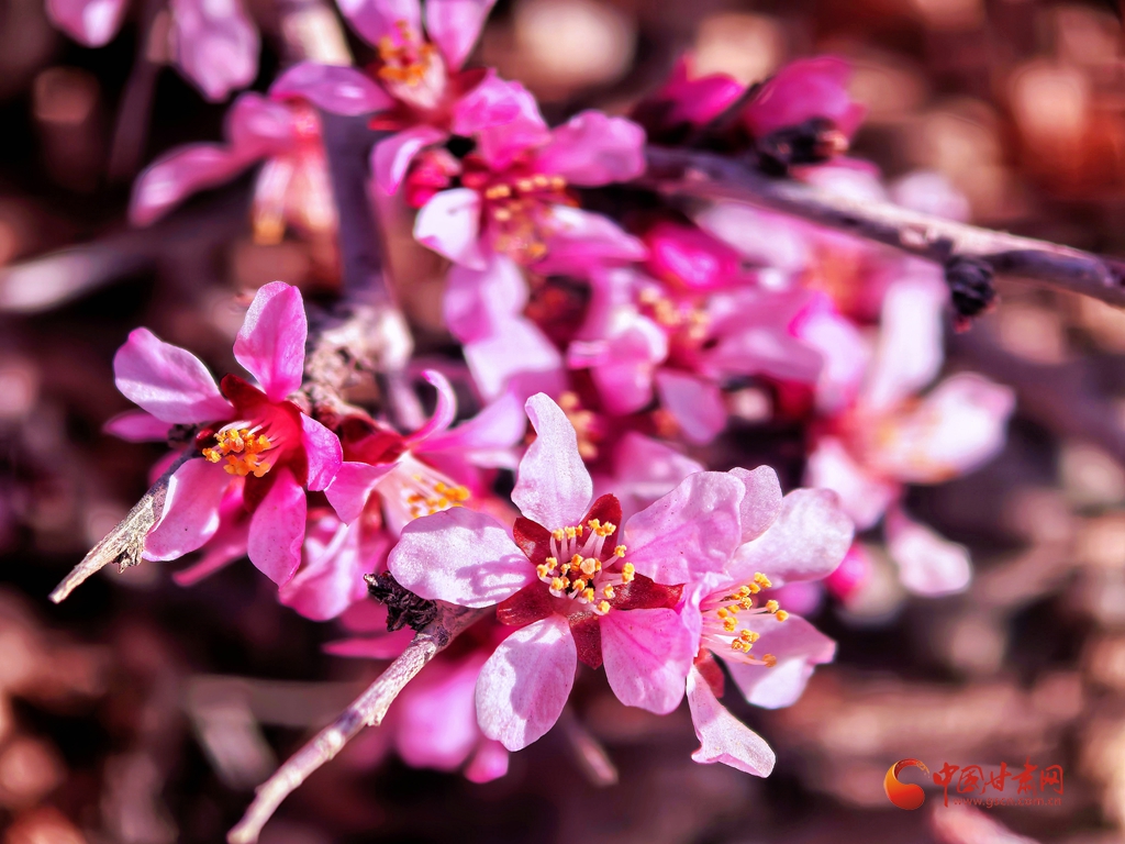 光禿禿的枝條上,不見半片新葉,只有一簇簇、一團(tuán)團(tuán)粉紅色的小花,密密匝匝地綴滿枝頭,擠擠挨挨,溫暖又熱烈。遠(yuǎn)遠(yuǎn)望去,像一縷輕盈的粉紅色云煙,輕輕飄落在蒼黃的山坡上,為沉寂的祁連山添上一抹難得的溫柔亮色;走近細(xì)看,花瓣薄如蟬翼,質(zhì)地輕盈細(xì)膩,嫩黃的花蕊纖細(xì)挺立,在寒風(fēng)中微微顫動(dòng),看似柔弱的外表下,藏著不屈的傲骨。偶爾一場(chǎng)春雪突襲,潔白的雪花壓彎枝頭,花朵看似垂落不堪,可待到雪化風(fēng)輕,它便立刻挺直腰肢,重新舒展花瓣。夜里寒霜凍得花瓣晶瑩透明,仿佛一碰就碎,可朝陽(yáng)升起,寒冰慢慢消融,花朵依舊盛放如初,不曾輕易凋零半分。