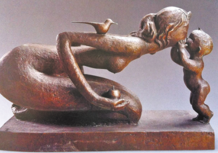 最后的廳,是一批中外馳名的雕塑代表作——從嬌小稚拙掌中把玩的小品到體量龐大高聳入云的巨構(gòu),無(wú)論隨形寫意、裝飾寫實(shí),美林都在策劃、構(gòu)成、調(diào)整、定型的繁復(fù)過(guò)程中,顯示出扎實(shí)的藝術(shù)功力與非凡的浪漫色彩。其中,龍、虎、馬、牛等動(dòng)物系列,不僅延續(xù)了繪畫中獨(dú)有的造型風(fēng)格,而且更凝重渾厚,更富裝飾情趣。與眾不同人見(jiàn)人愛(ài)的母子系列中,不論是精心呵護(hù)襁褓嬰兒的母親,匍匐草地引領(lǐng)學(xué)步的母親,牽手寶寶步入校園的母親,造型、肢體的夸張之奇變形之巧,感官、神態(tài)的風(fēng)韻依依顧盼有情,讓人駐足良久再三流連……