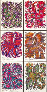 動(dòng)物系列繪畫,從扎實(shí)而靈動(dòng)的速寫與設(shè)計(jì)稿直至近似完美的正式作品,都蘊(yùn)含了畫家捕捉物象的執(zhí)著與機(jī)敏,提煉造型的睿智與不懈,有了心血與摯愛(ài)的投入,那成竹在胸別具一格的小貓小狗小豬小鵝小猴也就躍然紙上呼之欲出了。在長(zhǎng)方形的深色卡紙上,那銀色勾勒的活靈活現(xiàn)的百魚圖,讓我們沉醉于湛藍(lán)的海洋世界;在四方形的白色鏡框中,那七彩斑斕的百雞圖,讓我們迷戀于鄉(xiāng)間的濃郁風(fēng)情;還有鞠躬盡瘁一生奉獻(xiàn)膂力雄強(qiáng)的牛群系列,馳騁千里挾帶雄風(fēng)英姿勃勃的駿馬圖騰……