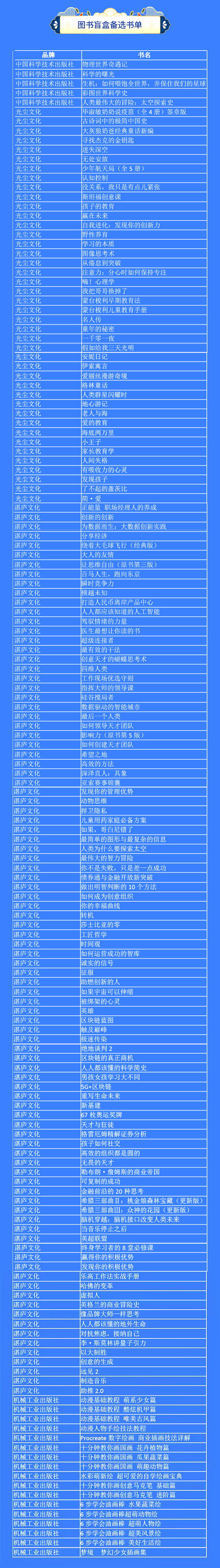 本次活動(dòng)由新華云商聯(lián)合機(jī)械工業(yè)出版社、中國科學(xué)技術(shù)出版社、光塵文化、湛廬文化共同推出。盲盒內(nèi)圖書涵蓋經(jīng)管技術(shù)類、歷史人文類、心理健康類等品類,將隨機(jī)搭配三本,可能與您的藏書重復(fù),或不符合您的閱讀愛好,請(qǐng)您慎重選擇理性購買。同時(shí),盲盒內(nèi)會(huì)附贈(zèng)新華網(wǎng)文創(chuàng)徽章或書簽。