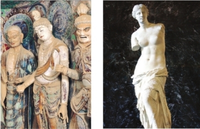 可是,“脅侍菩薩微笑著,在她低垂的眼中可能根本沒有勝負(fù)這回事。這種眼神是利他而非個(gè)人的……當(dāng)我們?cè)?5窟佛龕前微微俯下身子之時(shí),溫暖的奇跡出現(xiàn)了,她正慈祥地看著你。一位是由堅(jiān)硬的大理石所雕,另一位是由敦煌本地黏土所塑,維納斯和脅侍菩薩似乎代表了兩種生活態(tài)度。假如她們?cè)诒R浮宮中相遇,談?wù)撈鹈?。維納斯可能會(huì)唱起女詩(shī)人薩福的詩(shī)歌:‘你愛的就是美的。這容易解釋。’脅侍菩薩則依然保持微笑,靜靜地看著維納斯”。