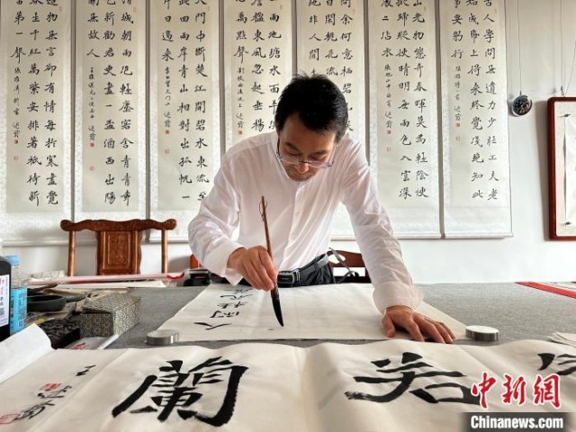 8月26日,甘肅通渭悅心國(guó)際書(shū)畫(huà)村,書(shū)法家在工作室創(chuàng)作。閆姣 攝