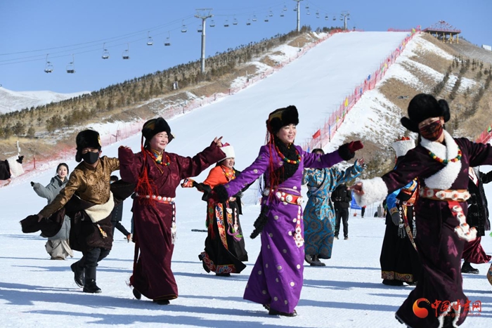 銀裝素裹的“冰雪嘉年華”現(xiàn)場(chǎng),來(lái)自當(dāng)?shù)氐母刹咳罕娚碇?jié)日的盛裝和游客們一起,隨著音樂(lè)的旋律,跳起了鍋莊。游玩區(qū),大人小孩參與其間,體驗(yàn)雙板滑雪、雪圈、雪地自行車等多種娛樂(lè)項(xiàng)目,歡聲笑語(yǔ)彌漫著整個(gè)雪場(chǎng)。