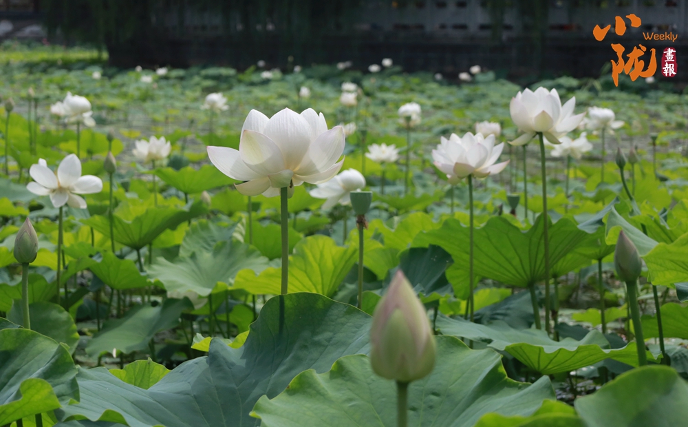 一朵朵、一簇簇、白色的荷花星星點點、清美動人點綴于成片的翠綠色荷葉間或肆意怒放,或含苞待放形成一幅美麗的生態(tài)畫卷。