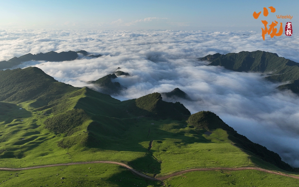 登頂望遠(yuǎn),千壩草原高山、草甸、草原相互交織,牛馬、羊群像一顆顆散落的珍珠點綴其中。茫茫云海鋪滿整個天際,翻涌的流云大河奔騰,蔚為壯觀,如臨于大海之濱。