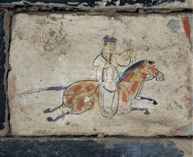 它的“不一般”,首先在于其“極簡(jiǎn)卻傳神”的藝術(shù)風(fēng)格。該磚的畫面以赭石色為底,墨線寥寥,卻生動(dòng)勾勒出一位策馬疾馳的驛使:頭戴魏晉幘帽,身著右衽短衫,左手控韁,右手舉著文書。而駿馬則四蹄騰空,動(dòng)態(tài)感十足,一種風(fēng)馳電掣的緊迫感似從畫中撲面而來(lái)。更耐人尋味的是,畫師刻意省略了驛使的嘴巴:這一“殘缺”設(shè)計(jì),并非疏忽,而是古人智慧的體現(xiàn),象征著郵驛制度中“守口如瓶”的保密原則,使其成為中國(guó)古代信息保密文化的生動(dòng)見證。