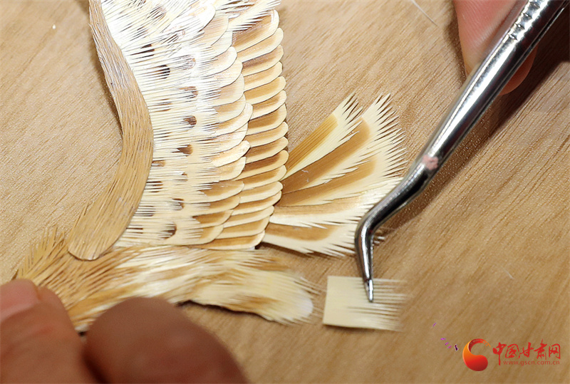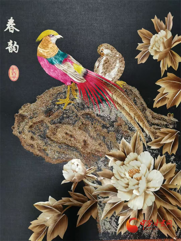 多年打磨后,郭百花走出了獨(dú)特的創(chuàng)作之路——以拼貼手法為主,讓作品更具層次感與立體感。在她十幾平米的“百花麥稈藝術(shù)工作室”里,《春韻》勾勒出江南詩(shī)意,《敦煌文旅》再現(xiàn)絲路風(fēng)情,《孔雀戲牡丹》盡顯雍容華貴,而《錦上添花》中,小鳥(niǎo)的羽毛竟由細(xì)如發(fā)絲的麥稈剪貼而成,市場(chǎng)價(jià)達(dá)1500元左右。這些作品里,既有山川花鳥(niǎo)的靈動(dòng),更藏著通渭的鄉(xiāng)土記憶,平凡麥稈在她手中徹底“化腐朽為神奇”。